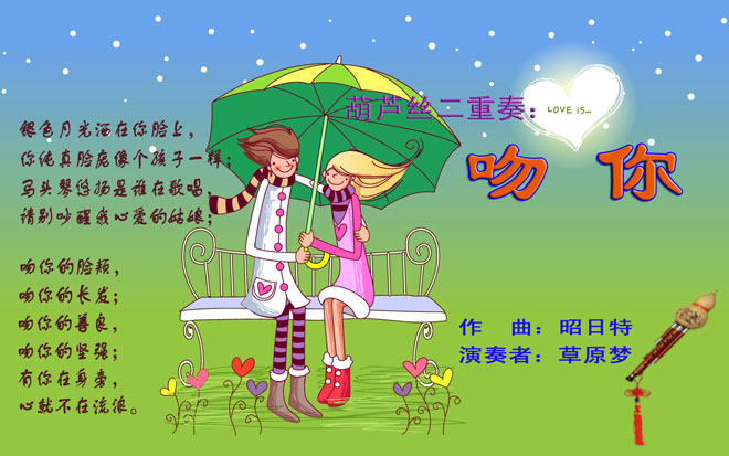 吻你的微笑。 吻你的忧伤。 有你的地方,哪里都是天堂。 吻你的沧桑。 吻你的花香。 骑上你的骏马,带我去飞翔。出自 电视剧《胡杨女人》大小D|调葫芦丝二重奏